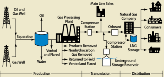 天然气从地下井中提取,在经过一系列的加工后,天然气会经由高压输送管道运输,输送管道包括了超高压管道、压缩站、储气设施等设备。管道天然气再由分配管道系统,将天然气输送到企业和用户家里。而罐装天然气直接由天然气公司用汽车运输等方式将天然气罐送去企业和用户家里。