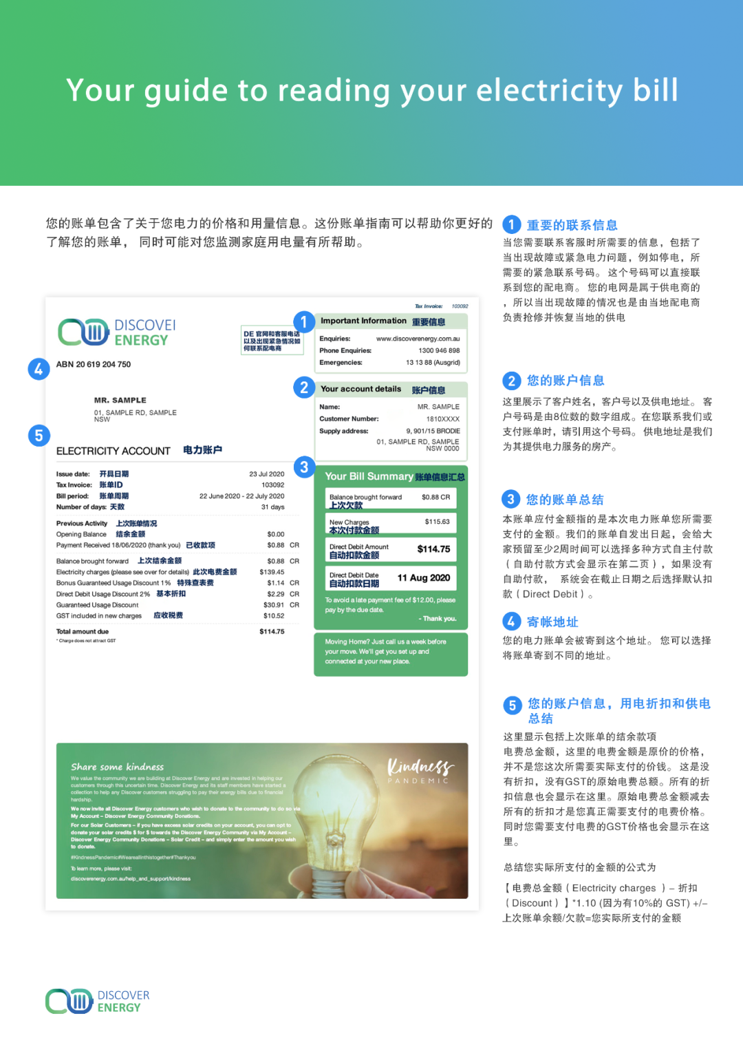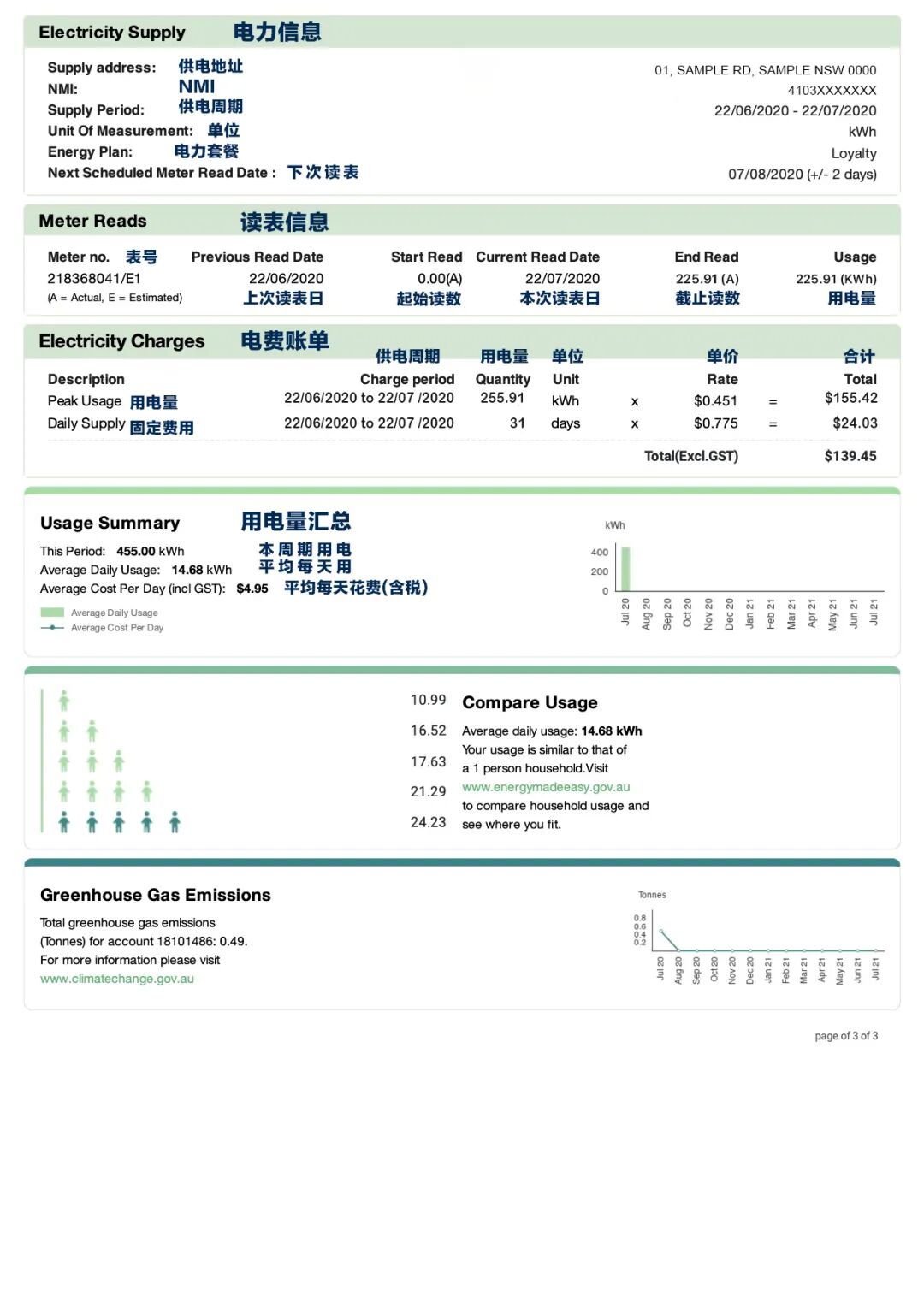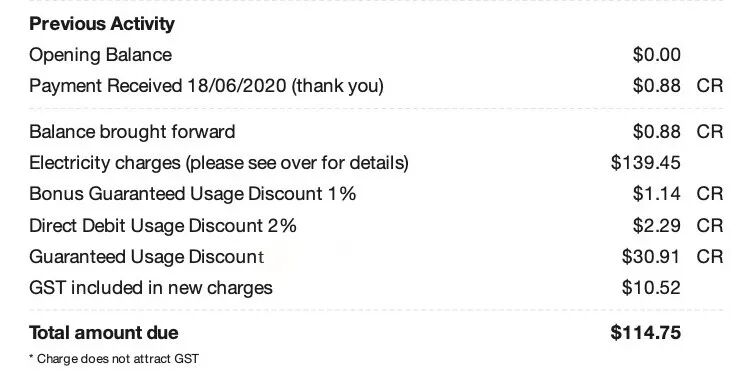 Electricity charges 电费总金额(在第三页会有明细说明):这里的电费金额是原价的价格,并不是您这次所需要实际支付的价钱。这是没有折扣,没有GST的原始电费总金额。