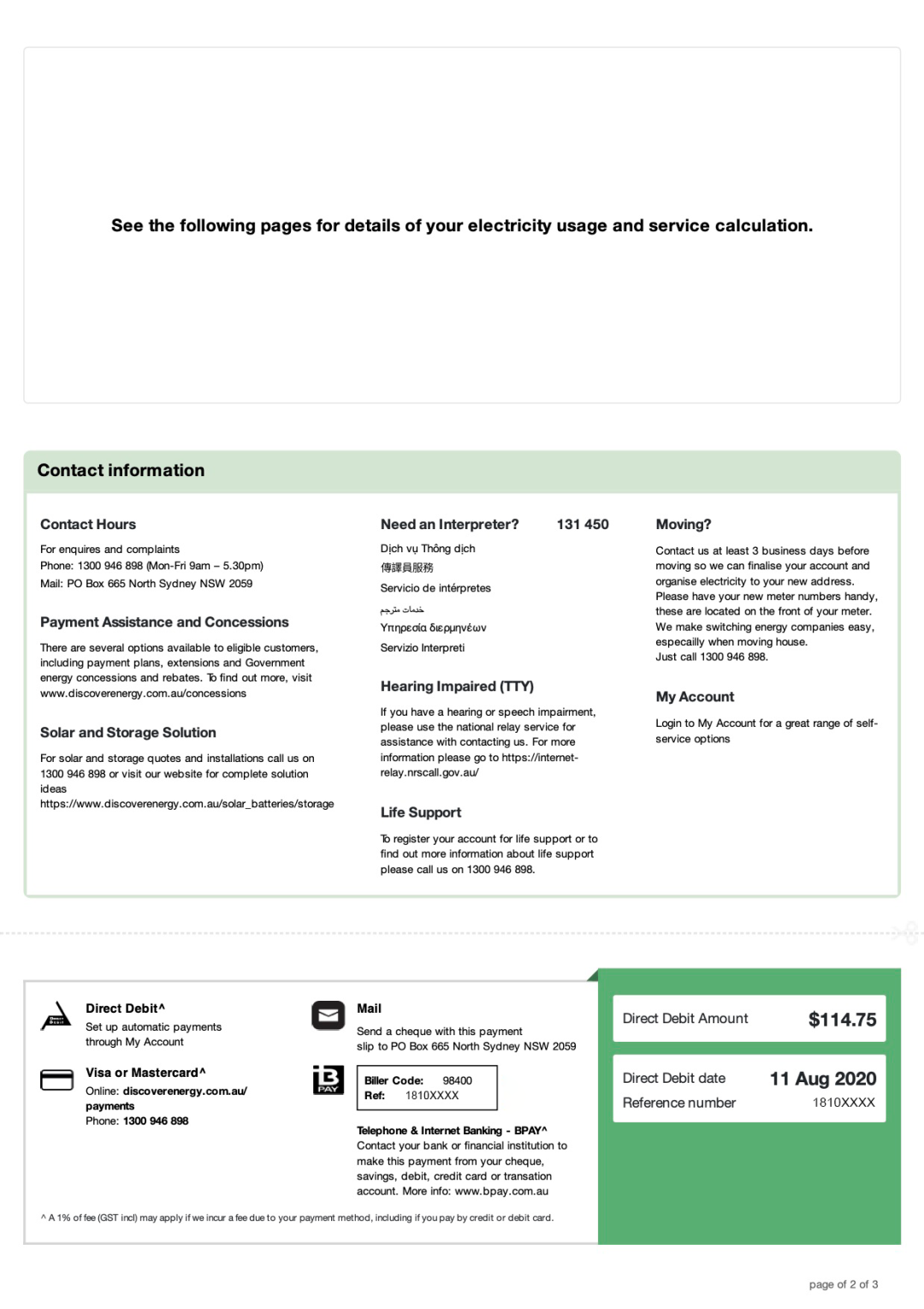 我们的账单自发出日起,会给大家预留至少2周时间可以选择多种方式自主付款(自助付款方式会显示在第二页),如果没有自助付款,系统会due day后选择默认扣款(Direct Debit)。